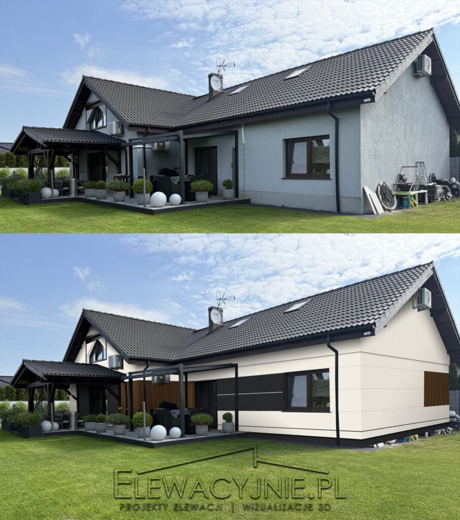 Nowoczesna elewacja z lameli często łączona jest z tynkiem w odcieniach bieli, szarości lub grafitu. Takie zestawienie pozwala uzyskać elegancki, ponadczasowy wygląd. W projektach domów jednorodzinnych lamele można zastosować nie tylko na fasadzie frontowej, ale także jako wykończenie tarasu, ogrodzenia lub podbitki dachowej.